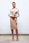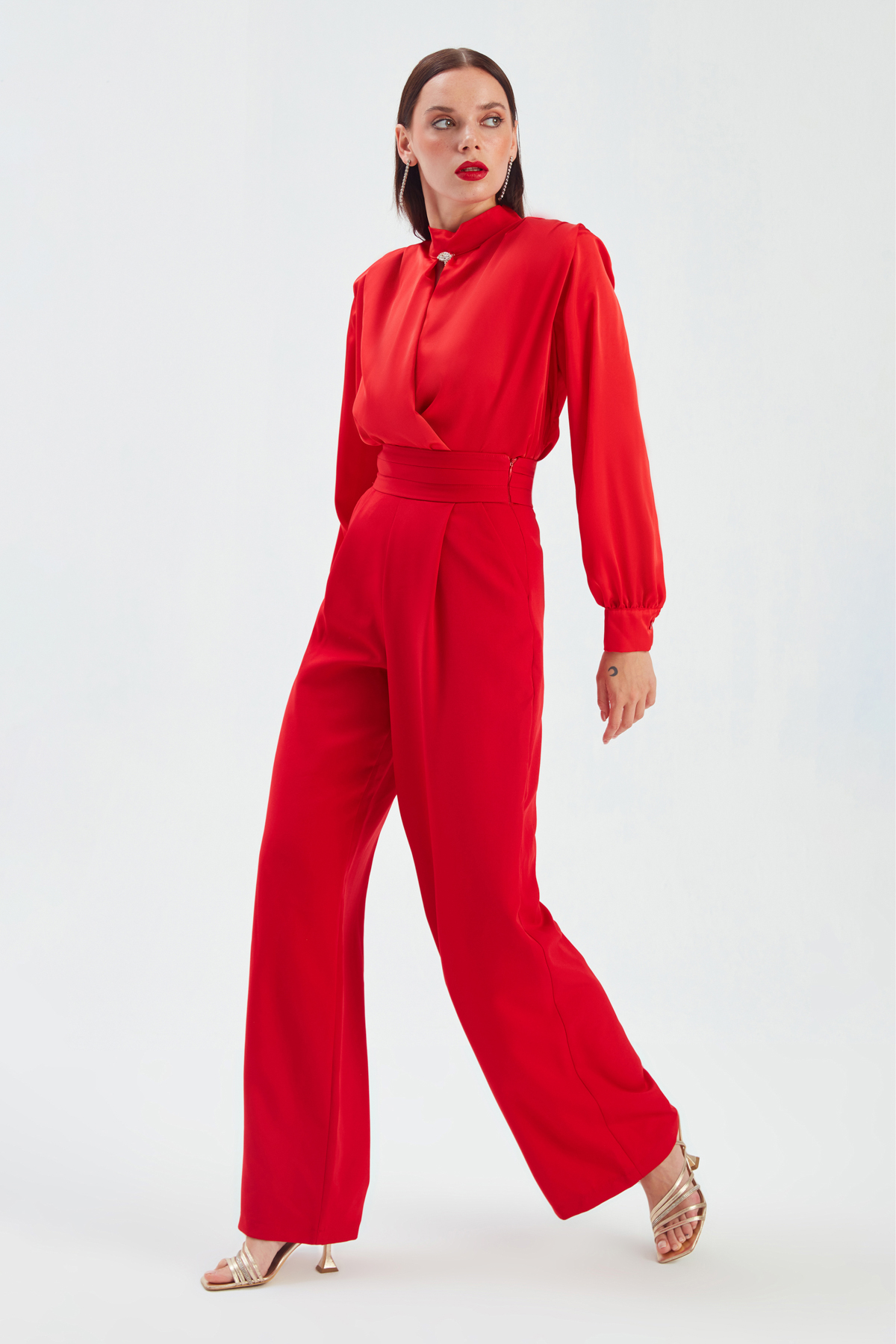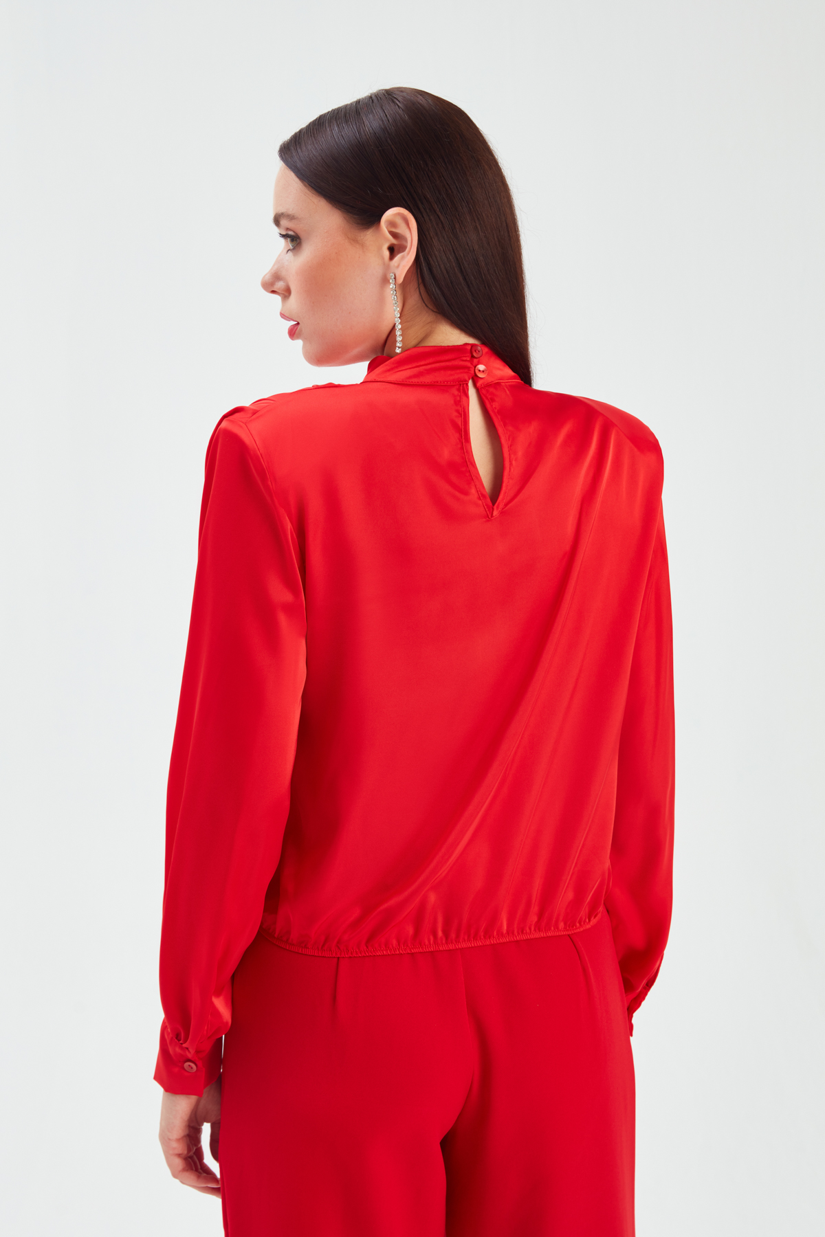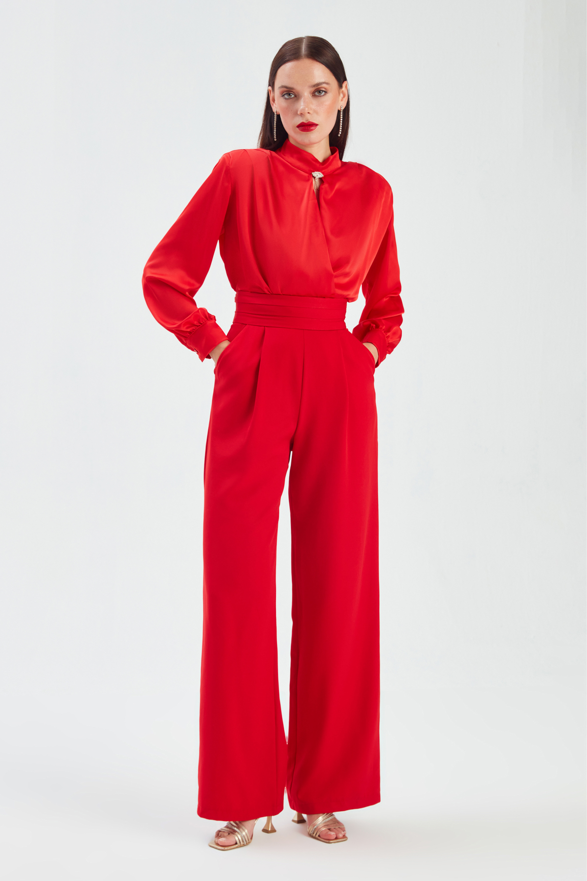 Double Breasted Satin Blouse with Accessory Detail – RED